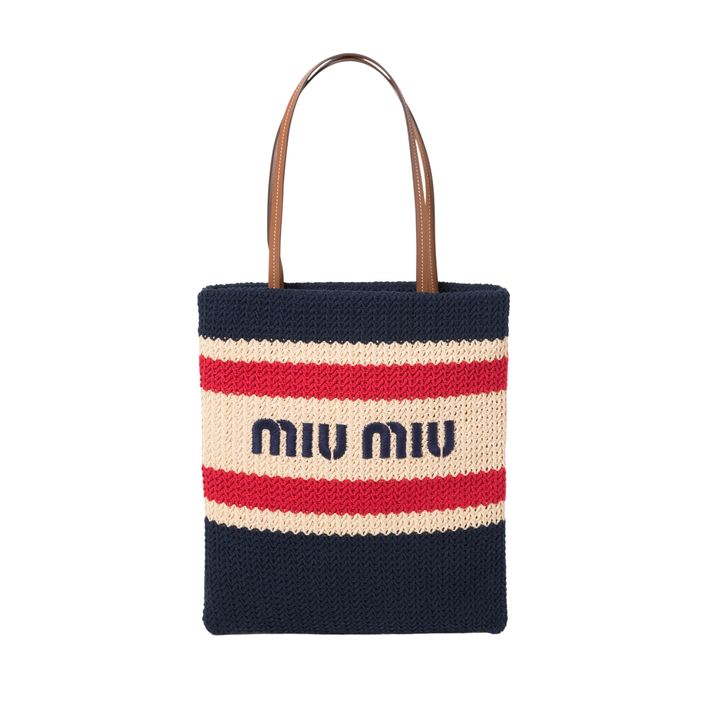 ネイビー×レッドのカラフルな配色とMIU MIUロゴが視線を引きつけ、キャッチーでアイコニックな印象に。クロシェ編みならではの軽やかな表情も魅力。カジュアルにもモードにもなじむ万能さが魅力。