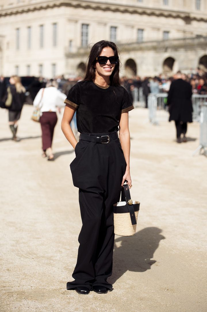 クリーンなオールブラックのスタイリングに、ラフィアのナチュラルな質感をプラス。重くなりがちなモノトーンに軽やかさが生まれ、ぐっと季節感のある着こなしに。