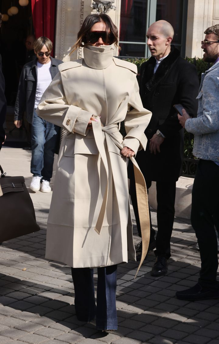 2025年3月、ファッションウィーク中のパリでキャッチされたヴィクトリア。エッジの効いたトレンチコートに、センタープレスが際立つブーツカットデニムを合わせ、完璧なバランスを披露しました。こうしたドラマチックなシルエットには、オーバーサイズのサングラスやビッグサイズのバッグなど、存在感のある小物を添えるのが◎。強さと美しさが共存する、究極の「パワー・ドレッシング」が完成します。