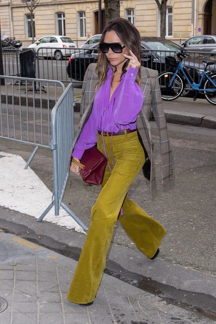 レトロなムードをモダンに再解釈したカラー使いも得意なヴィクトリア。2022年3月には、70年代のエスプリを感じさせる、パープルとオリーブグリーンのヴィンテージ感あふれるルックで颯爽と登場しました。さまざまな質感をミックスしつつ、深みのあるトーンで統一することで、プレイフルながらも落ち着きのある雰囲気に。