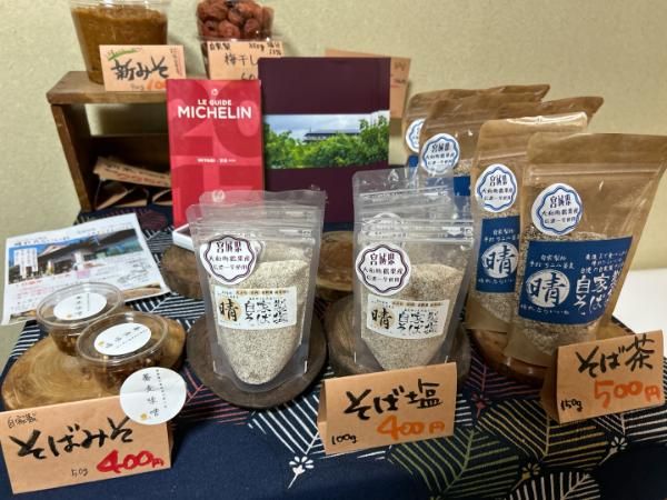 店内では、お蕎麦を使用したみそ、塩、お茶が購入できます。