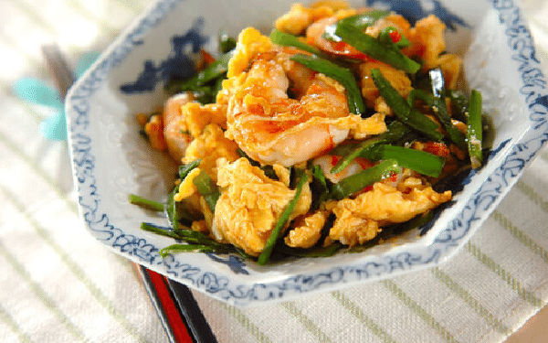 エビ入りでボリュームのある一皿です。エビは丁寧に下処理をすることで、臭みを防げます。エビのプリプリ感と卵のコラボは格別! ニラは最後に入れて、旬の彩りを添えましょう。
