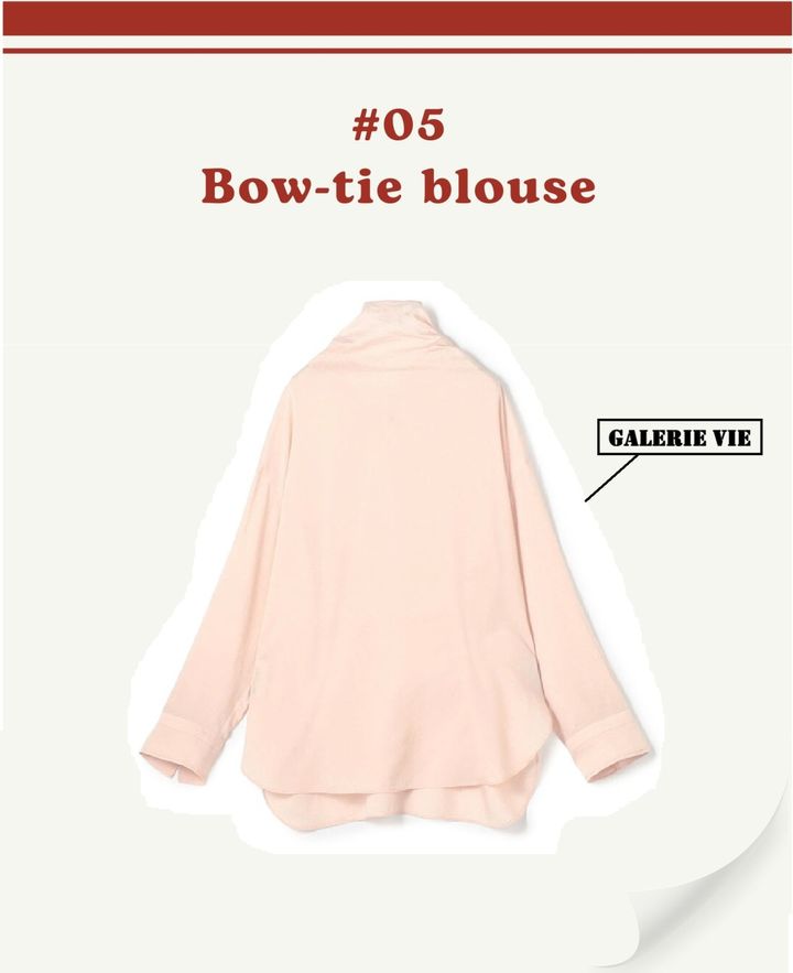 「スカーフを纏ったような襟元の自然なドレープが美しく、上品さとほどよい抜け感を感じる一枚。ボウタイは後ろで一掛けしたりフロントに垂らすなど、その日のコーディネートに合わせてアレンジを楽しめます」(手塚さん)