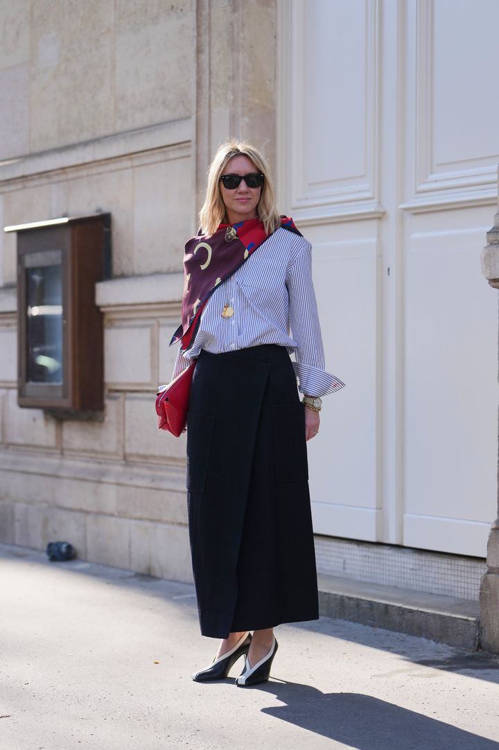 大判のスカーフを首元で結び、ストールやケープのようにアシンメトリーに垂らすのもシックな取り入れ方。ミニマルなオフィスルックのアクセントになるうえ、夜のお出かけにちょっとした華やかさをプラスしたいときや、気温が下がるときの冷え対策としても一役買ってくれる。