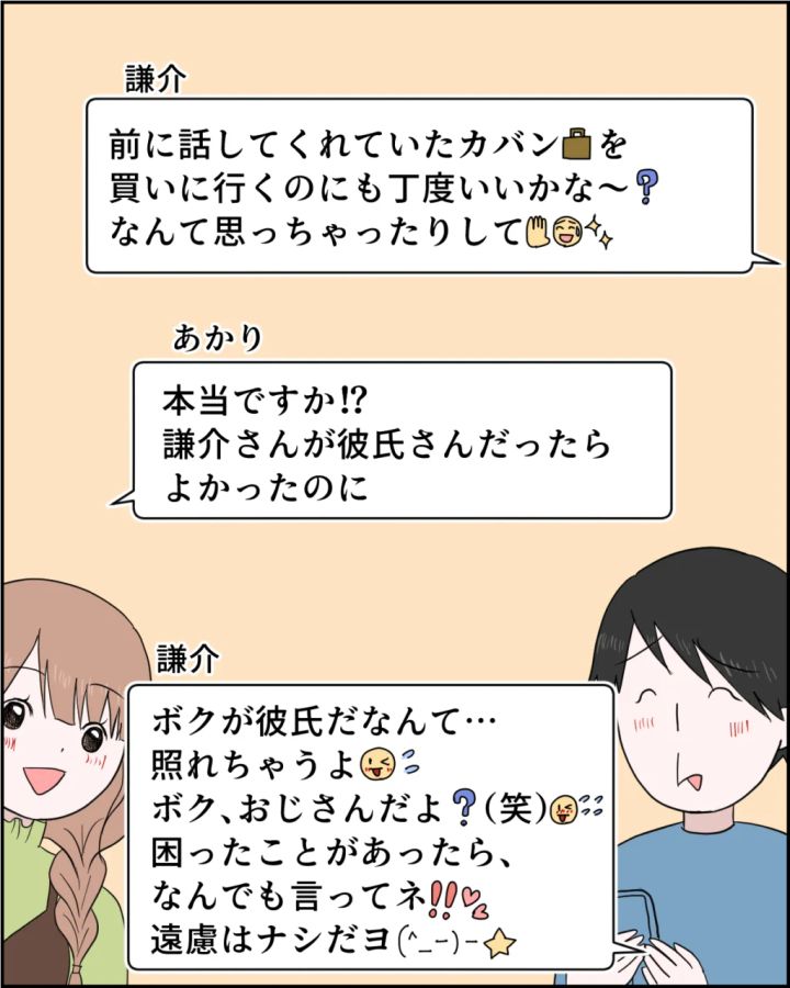 謙介「ボクが彼氏だなんて・・照れちゃうよ。ボク、おじさんだよ?(笑)困ったことがあったらなんでも言ってネ!遠慮はナシだヨ(ウインク)」