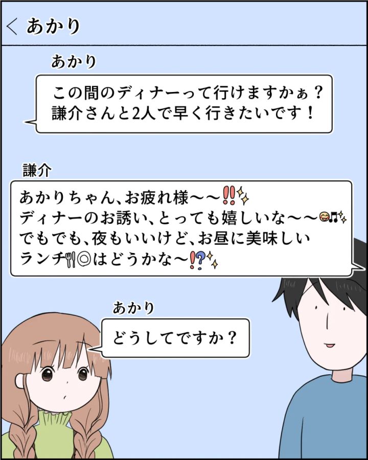 あかり「この間のディナーって行けますかぁ?謙介さんと2人で早く行きたいです!」