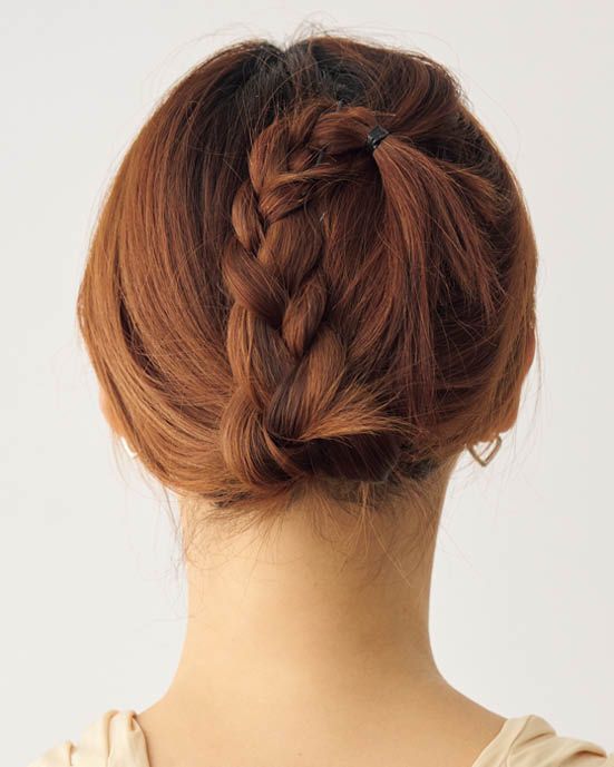 襟足より下まで髪の長さがある人は、細いゴムでひとつに結んでまとめます。なるべくボリュームをおさえたいので、長さのある場合は三つ編みにしてコンパクトにまとめてください。