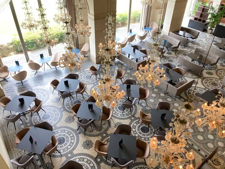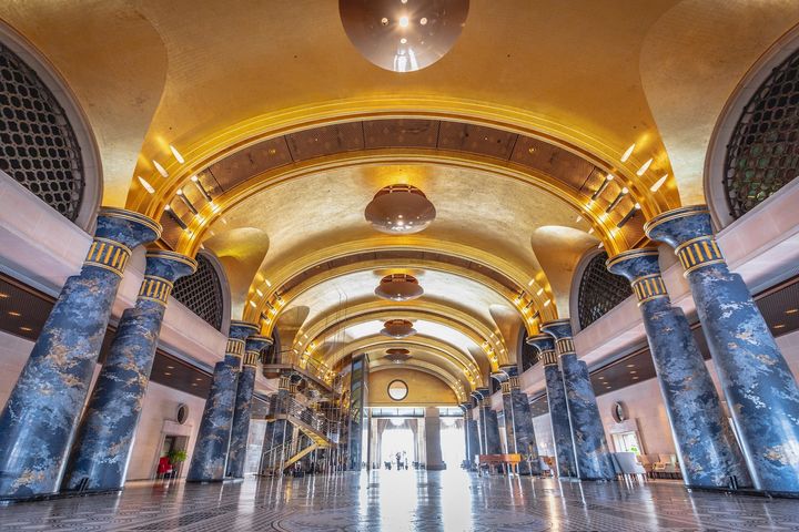 館内に入ると、大空間のロビーが広がる。22.5金の金箔で覆われたドーム天井は、その規模の大きさでも知られ、空間全体に強い印象を与える。これを支える柱には、ドイツの伝統技法をもとに制作された人工大理石が用いられ、床にはイタリアの職人によるモザイクが敷かれるなど、各国の技術が細部にまで取り入れられている。