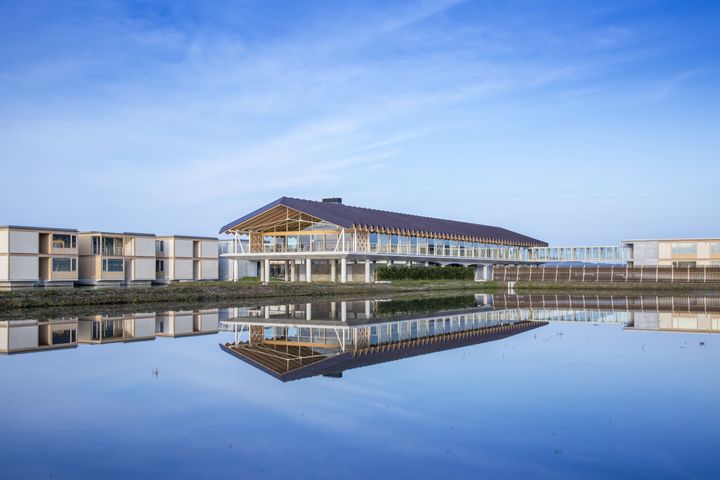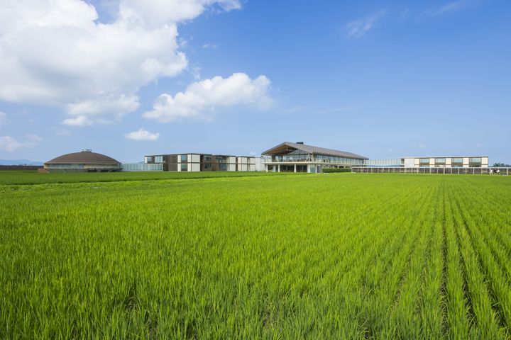 2018年、坂茂の設計により開業した「SHONAI HOTEL SUIDEN TERRASSE」は、山形県庄内平野の水田風景のなかに浮かぶように建つホテル。建物は水面に映り込み、自然と一体化するよう計画されている。