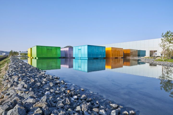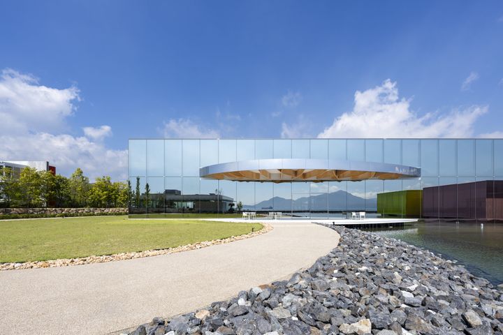 海側の水盤には、色彩豊かなガラスで覆われた複数の可動展示室が配置されている。瀬戸内の多島景観に着想を得たこれらの展示室は、造船技術を応用した水に浮かぶ構造となっており、配置を変えることも可能だ。館内では、近代絵画や工芸作品など多様なコレクションを収蔵・展示する。