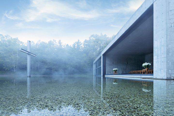 北海道の雄大な自然に抱かれた「星野リゾート トマム」の一角に佇む「水の教会」は、安藤忠雄による教会三部作のひとつとして知られる建築。森に囲まれた敷地の奥へと導かれる長いアプローチは、日常から静かに切り離されていくための序章のよう。壁を抜けた先に現れる水面は、訪れる者の感覚を一気に非日常へと引き込む。
