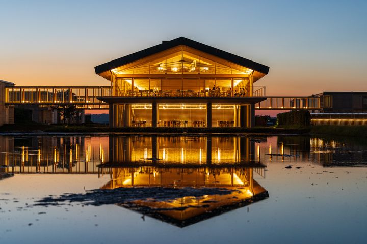 本施設は、レストランやライブラリーを有する中央のパブリック棟を起点に、客室棟が水田の上に点在し、ガラス張りのテラスや渡り廊下がそれらをゆるやかにつなぐ構成。移動するたび、まるで田園の上を歩くような感覚をもたらす。