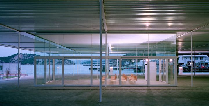 特徴的なのは、敷地の大半を覆う大屋根。約3,600㎡の薄いスチール屋根が、直径約85mmの細い柱によって支持され、視界を遮らずに水平に広がる構成となっている。フェリーからも認識しやすく、周囲の風景と連続するランドマークとして機能している。