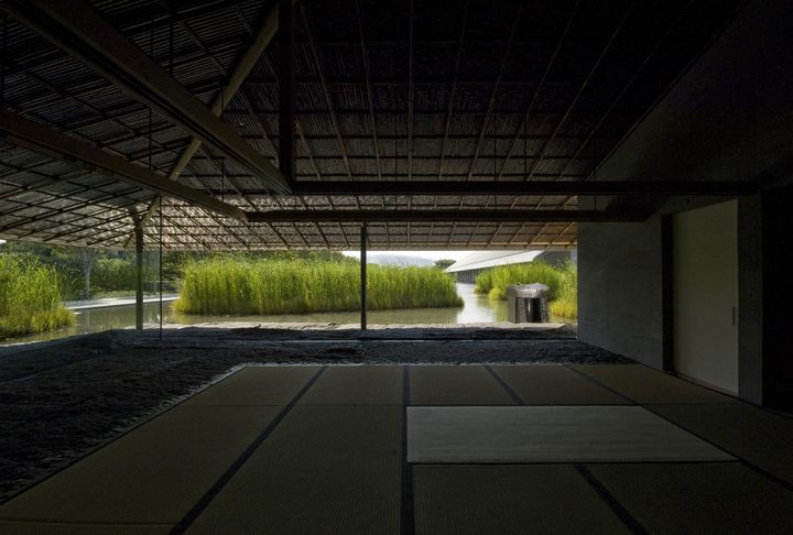 茶室は水没する小間と水中に浮かぶ広間からなり、広間の床は水庭の水面とほぼ同じ高さに保たれている。これには「水面と同じ高さに座す。人は自然と同じレベル、目線で生きていかなければならない」という思いが込められているという。