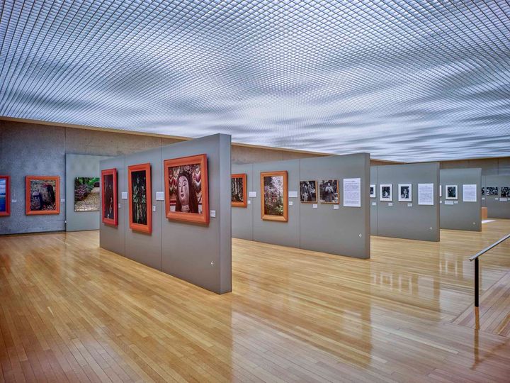 内部では、外光に満ちたエントランスから一転、展示室は閉じた空間へと切り替わる。窓を持たない展示室では、写真そのものと向き合うための静かな環境が整えられ、土門の代表作《古寺巡礼》や《室生寺》などが空間のなかで際立つ。(常設展はない。展示内容は年間スケジュールを参照。)