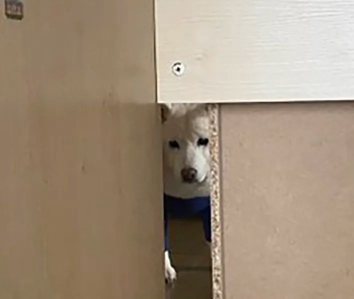 なんと、隙間からまつちゃんがジッとこちらを見つめていたのです!