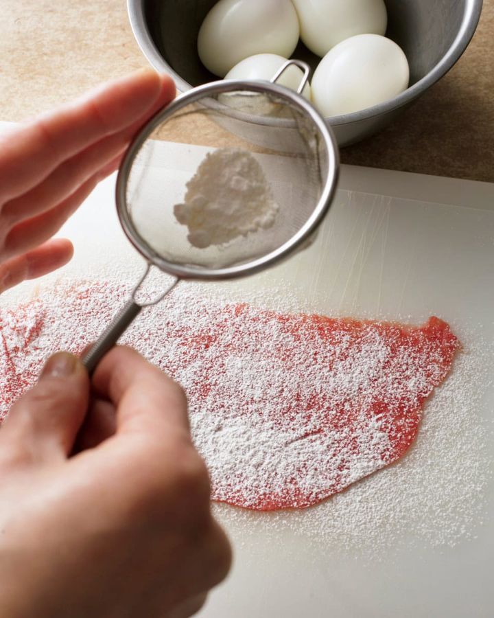 巻く前に小麦粉をふることで、肉が具材からはがれにくくなります。小麦粉は茶こしでふると、均一に薄くふることが可能。