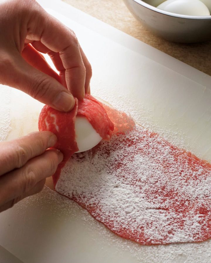 1.牛肉1枚をまな板に広げ、小麦粉を茶こしで全体に薄くふる。ゆで卵を端にのせ、牛肉で包むようにしてくるくると巻く。残りも同様に作る。