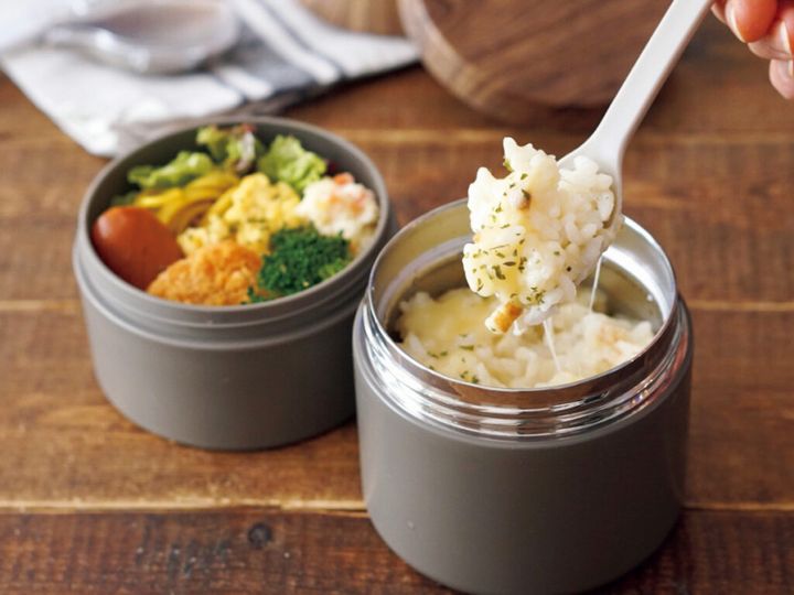 炊きたてのご飯にパスタ用のカルボナーラソースを流しかけ、溶けるチーズ(加熱不要)をのせてふたをすれば、食べるころにはとろ~り♪ 豚の照り焼き丼もスープジャーに入れるとほかほかです
