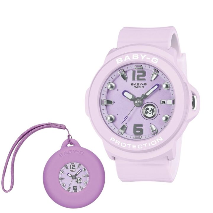 時刻が見やすい3針タイプのシンプルなダイアルでデイリー使いに最適。センターケースを付属の専用ホルダーにセットすればチャームに早変わり。曜日表示はデザインが日替わりで変わるという楽しい仕掛けも。¥12,100/ベイビージー(カシオ計算機 お客様相談室)