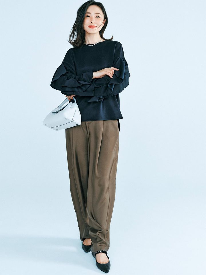 ブラウス¥19,580(ミュール)パンツ¥20,900(ジャスグリッティー/ジャスグリッティー プレスルーム)バッグ¥42,900(オルセット/オルサ)ピアス¥27,500(リューク)