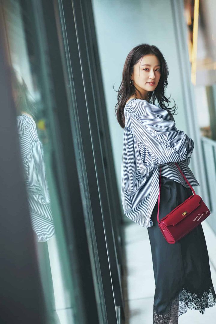 ストライプブラウス¥29,700(プルミエ アロンディスモン)スカート¥29,920(アストラット/エディット ユナイテッドアローズ梅田店)バッグ¥253,000(アニヤ ハインドマーチ/ロンハーマン)ピアス¥42,900(ete bijoux)