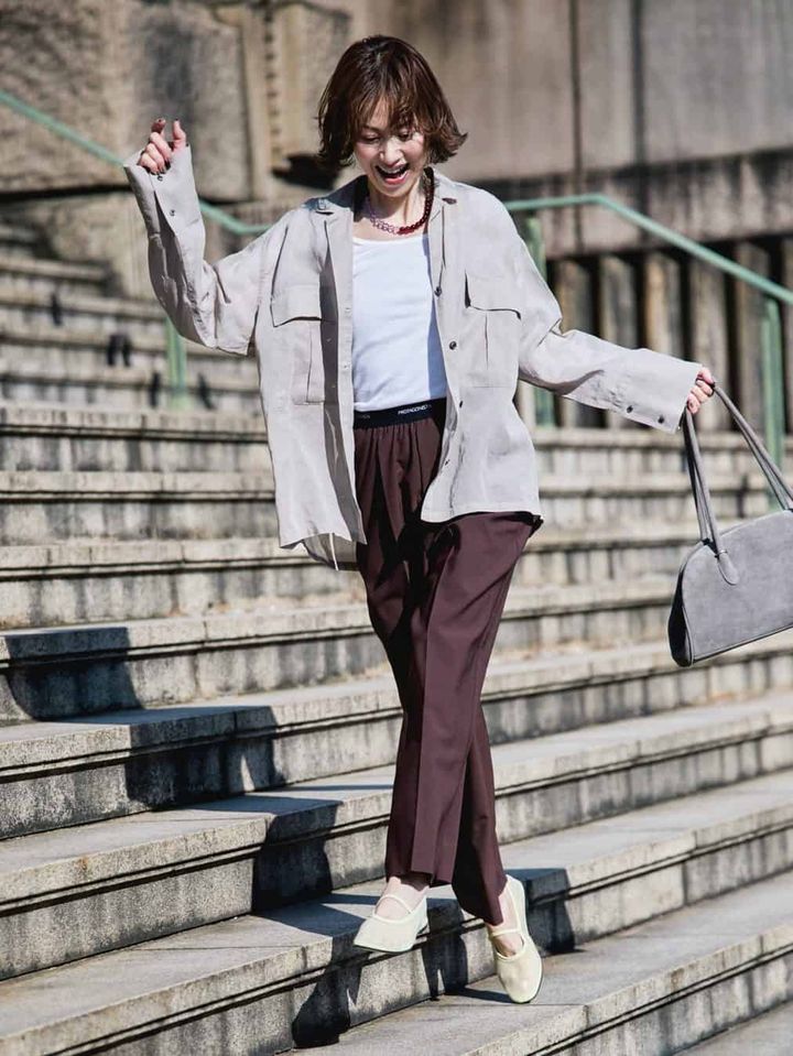 ブルゾン¥18,700(トラッツォドンナ)Tシャツ¥13,200〈ダブルスタンダードクロージング〉パンツ¥46,200〈ソブ〉(ともにフィルム)バッグ¥35,200(銀座かねまつ/銀座かねまつ6丁目本店)ピアス¥29,700リング¥33,000〈ともにウノアエレシルバーコレクション〉バングル¥24,200〈ワンエーアールバイウノアエレ〉(すべてウノアエレ ジャパン)