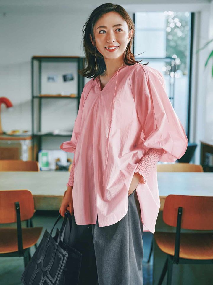 風をはらむような素材とサイジングのシャツは、ボディラインを拾わず、かといって張りもせず、軽やかに体型をカモフラージュ。ゆとりのある身幅で腰まわりも自然にカバーしつつ、全体はシャープな印象に。きちんと感を保ちながら、体型を美しく見せてくれる一枚です。インナーはフィット感のあるものがゆとりを強調できて良し。アウトラインは隠せるので、メリハリを重視したい!