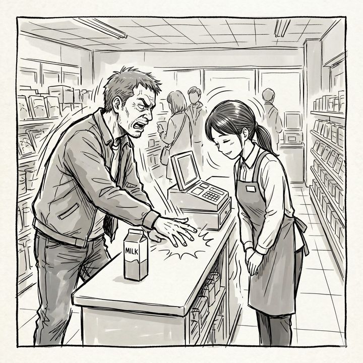 ささやかな買い物のひとときが、瞬く間に息苦しい空間へと変わってしまいました。周りの客たちも皆、居心地悪そうに目を伏せ、この気まずい時間が早く終わるのを願っている様子です。