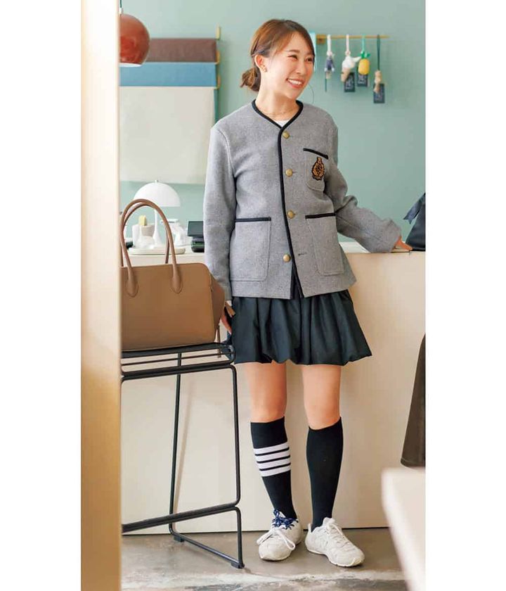 miu miuのスニーカーは白ベースなのでカジュアルにもトラッドにも好相性。CABaNのエンブレムジャケットはグレーで少しカジュアル感を出したのもこだわり。ハイソックスはトム ブラウン一択。