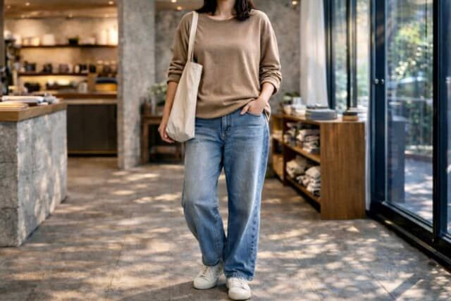カットソーやデニム、スニーカーといったカジュアルなアイテムは、肩の力が抜けた自然体の魅力を引き出してくれます。今の空気感にもなじみやすく、安心して選べるスタイルです。ただ、全体を同じテンションで揃えてしまうと、コーデにメリハリが生まれにくくなります。