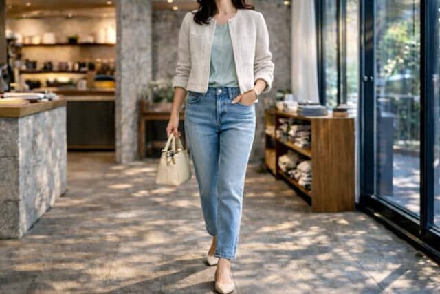 一方で、カジュアルなベースにきれいめ要素を加えたMIXスタイルは、抜け感ときちんと感のバランスを取りやすいのが特徴。例えばデニムに軽やかな素材のトップスやコンパクトな羽織りを合わせるだけでも、印象は大きく変わります。さらに小物にレザーなど質感のあるアイテムを取り入れることで、全体が引き締まり、自然な洗練感が生まれます。