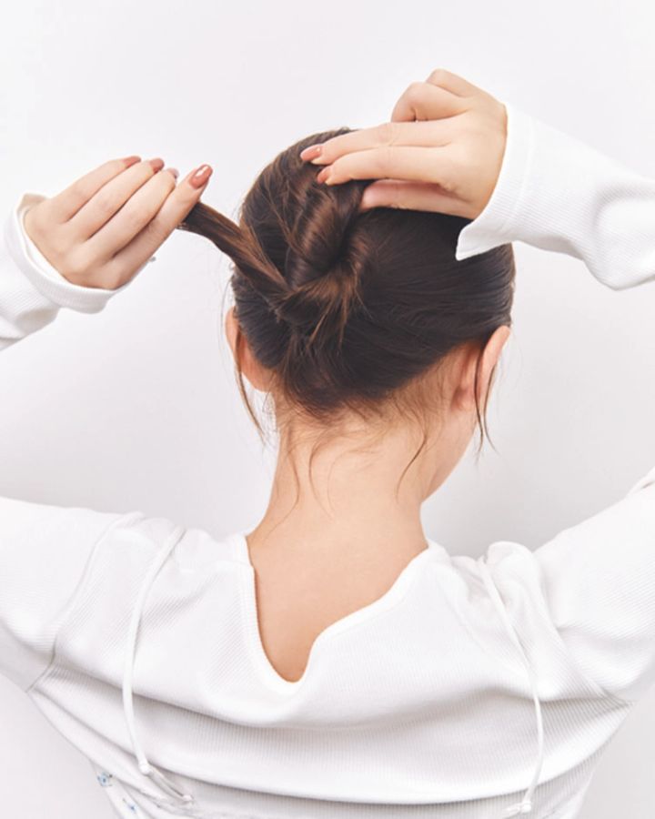 残った毛先を、2で折りたたんだ部分にぐるりと巻きつけておだんご状にする。この状態でクリップをはさんで固定。おだんごのなかに毛先を入れ込まずに残しておくと、カチモリ風に仕上がる。