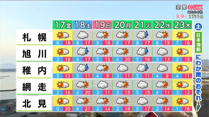 土曜は網走で20度、北見は21度まで気温が上がりますが、天気は変わりやすく日本海側の所々でにわか雨があるでしょう。日曜は広く日が差す見込みです。