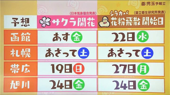 そして、週末はサクラ開花の便りが次々に届きそうです。こちらはサクラの開花と、同時期にシーズンを迎えるシラカバ花粉の飛散開始の予想日です。札幌はあさって土曜日にサクラが開花し、シラカバ花粉も飛び始めそうです。