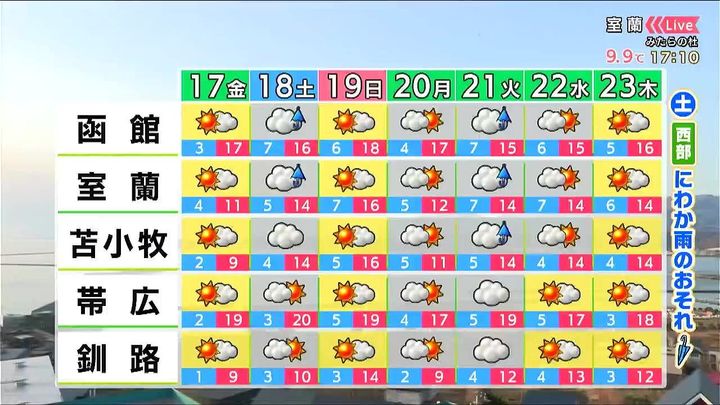 あす17日(金)の時間ごとの天気。道央・道南からです。