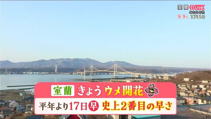 春の陽気で、室蘭ではきょう16日(木)、ウメが開花しました。平年より17日も早く、史上2番目の早さでの開花となりました。来週後半にはサクラも開花しそうです。