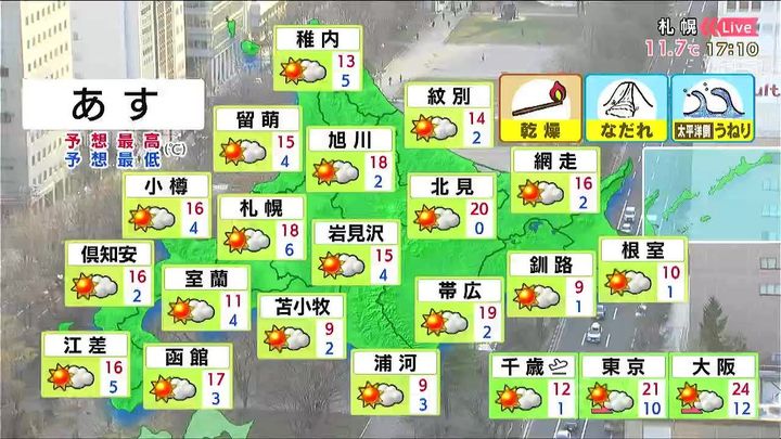 あすも晴れますが、風はきょう16日(木)より強まります。気温は高めで、オホーツク海側の寒さは解消するでしょう。空気の乾燥やなだれ、太平洋側ではうねりにも注意して下さい。