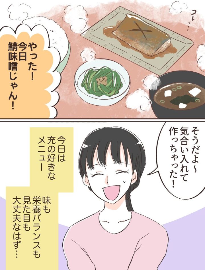 ドキドキしながら料理を並べました。今日は充の好きな鯖味噌を作りました。味も栄養バランスも良いし、見た目だって完璧にできたと思うけど、充は気に入ってくれるかな。家での食事なのに、私は緊張感を否めません。