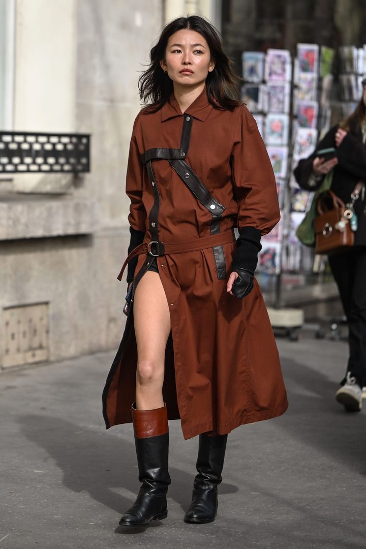 レザーのあしらいが特徴的な、ワークテイストの変化球シャツワンピース。着こなし全体の印象が重くならないよう、ボタンを外して脚を見せるおしゃれアイディアにセンスが光る。