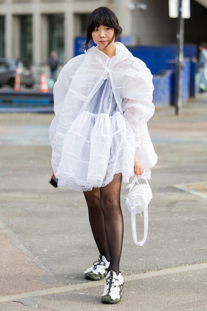 クリノリンを現代風にアレンジしたようなボリュームワンピースにも、シアー素材が好相性。少女らしさを感じる愛らしいコーディネートは、スニーカーでハズすことで甘さ控えめに。