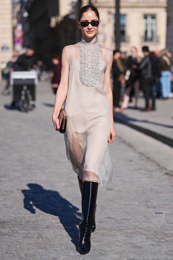 ①ミディ丈シアーワンピース×ロングブーツのおすすめコーデ