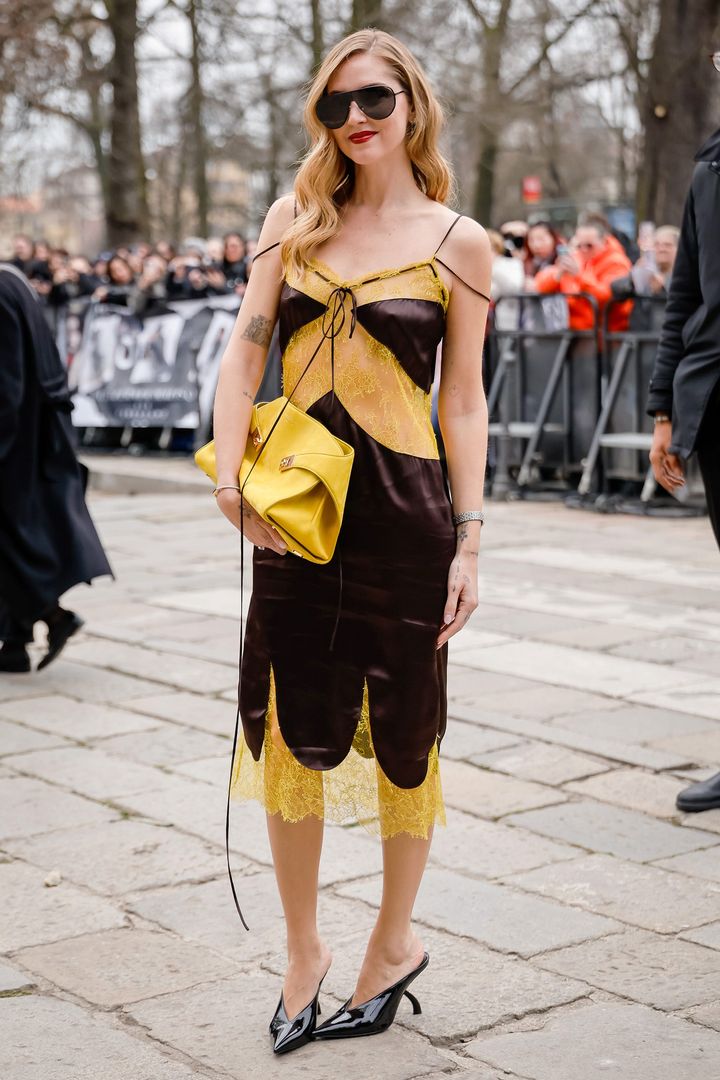 上品な光沢を放つ生地と、鮮やかなイエローのレースをリズミカルに組み合わせた異素材MIXに熱視線。大きめのクラッチバッグを携えて、シンプルながらインパクトのある装いに。