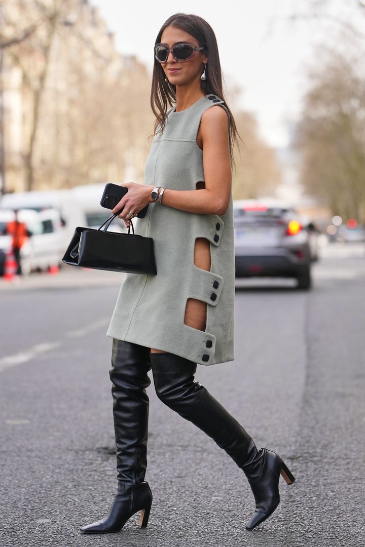 ③ノースリーブレトロミニワンピース×ニーハイブーツのおすすめコーデ