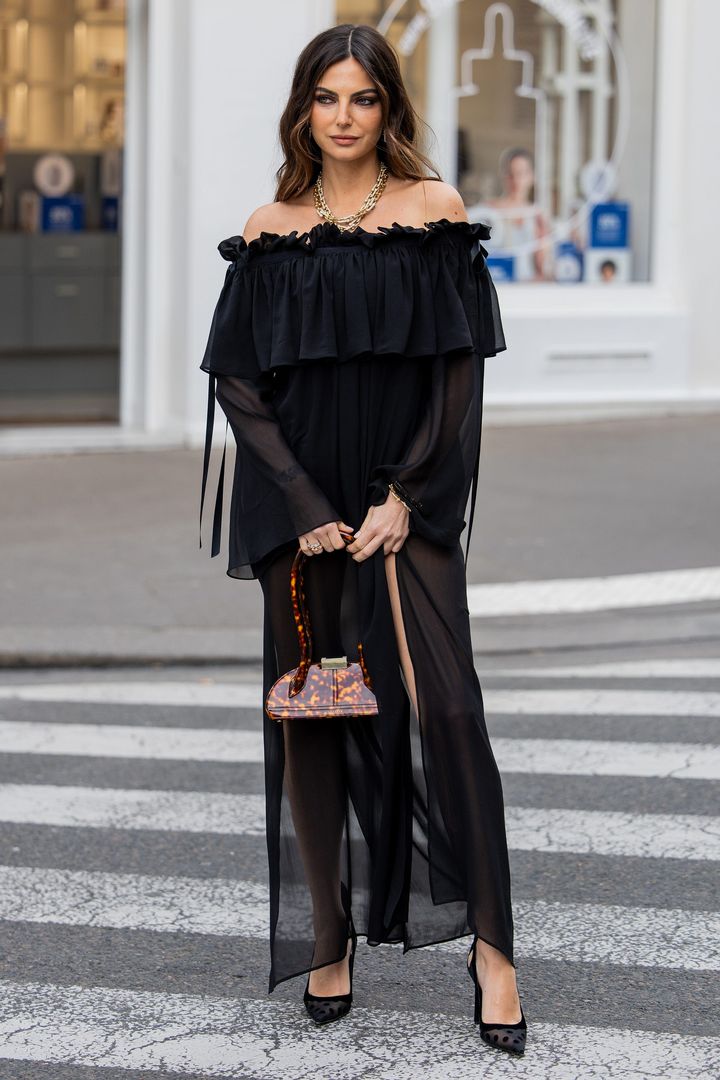 オフショルダーにフリルを添えた華やかなワンピース。ちょっぴりセンシュアルなシアー素材は、黒を選ぶとぐっとモードな表情に。べっ甲柄のミニバッグで知的なオーラをプラス。