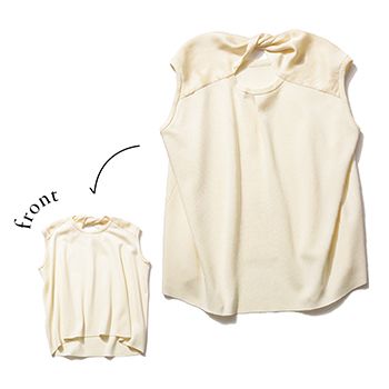 ノースリニット/エストネーション 肩まわりの部分的なサテン生地が、ソフトなニットのレディ度をアップ。首元のねじれも甘さを生むギミックに。