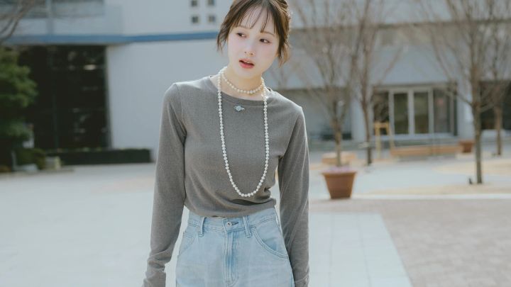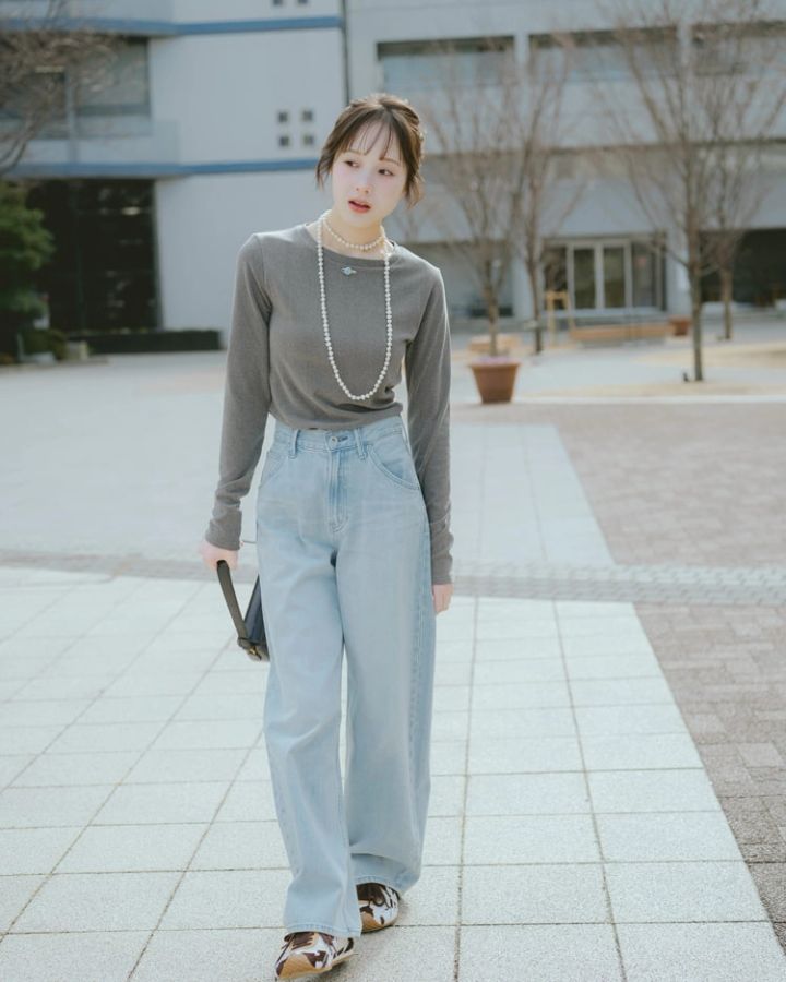 トップスのグレー&淡いブルーデニムが相性抜群。ラフなデニムで親しみやすさを出しつつ、知的で落ち着いた雰囲気に♡