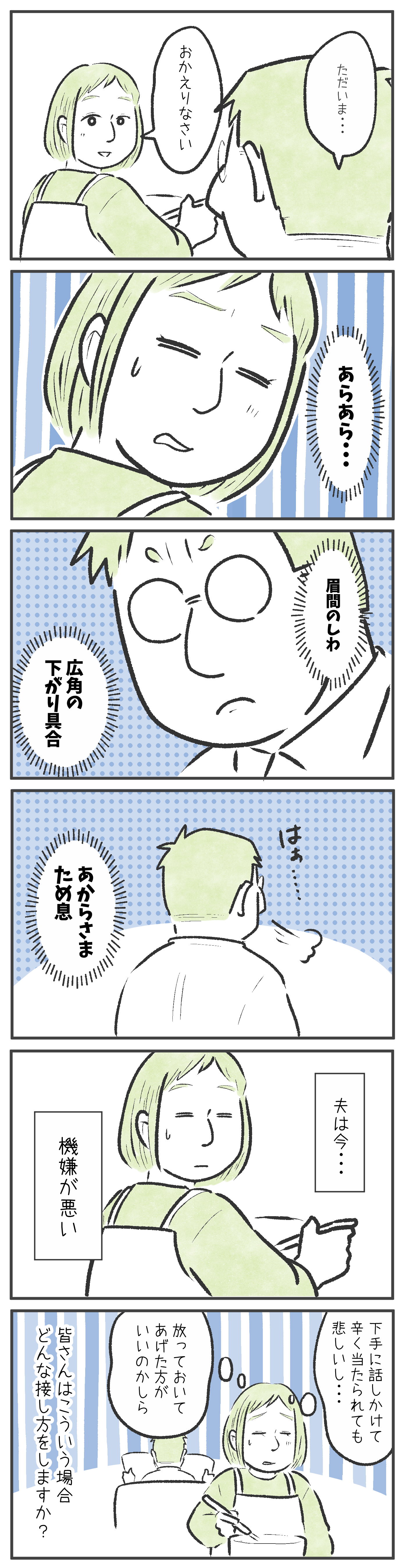 ドアの閉め方。返事の短さ。空気の良くない無言……。自分が何かした覚えがなくても、「あ、今日はそういう日か」とわかってしまう。わかってしまうから、ちょっと面倒なんですよね。