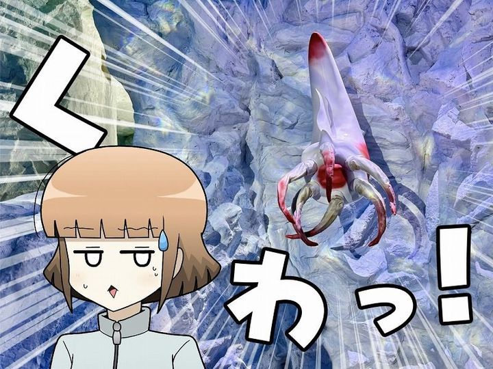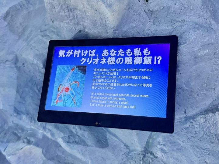 バッカルコーン(捕食用の触手)を広げた状態クリオネのモニュメントの前で、獲物の気分で写真が撮れます。(捕食形態のクリオネさん怖すぎる……!)