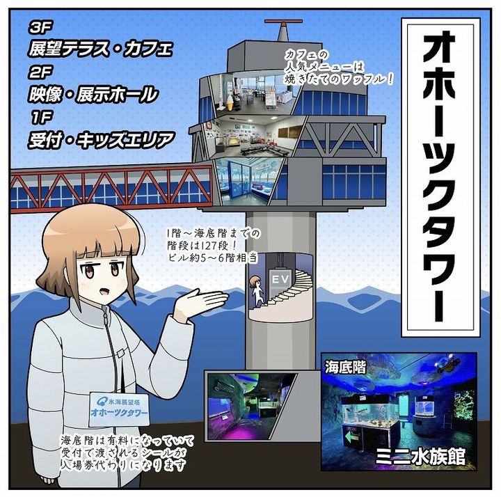オホーツクタワーは海岸から約1キロ沖合の海上展望施設で、海上3階、地下(海底)1階の構造をしています。